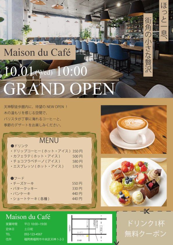 - 目的(制作の狙い):新規オープン告知、周辺住民や通勤客の集客